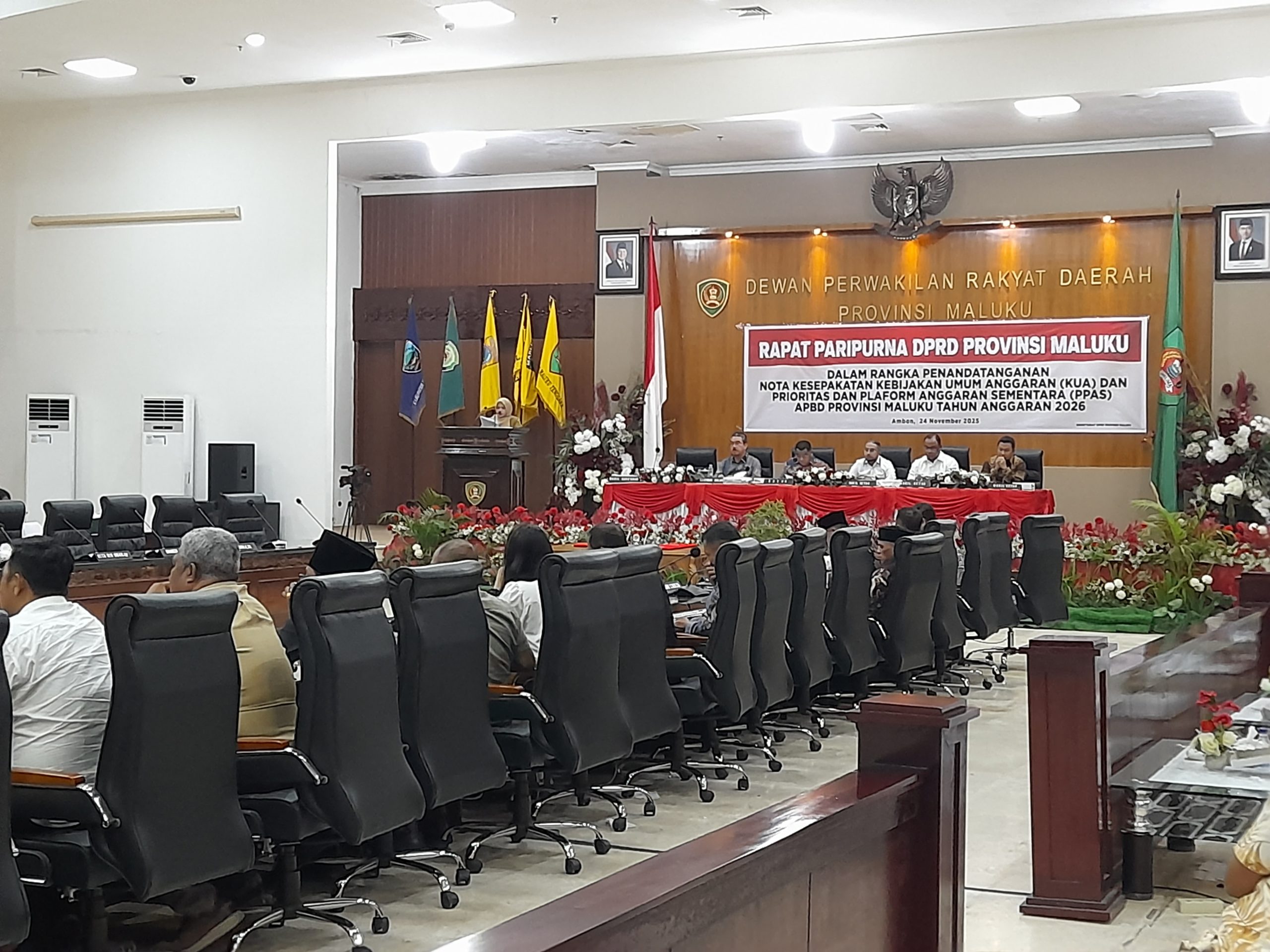 Hal ini disampaikan oleh Kabag Umum dan Keuangan DPRD Maluku, Asmain Pelu, saat membacakan hasil kerja Banggar dalam rapat paripurna pembahasan APBD 2026, Senin (24/11/2025).