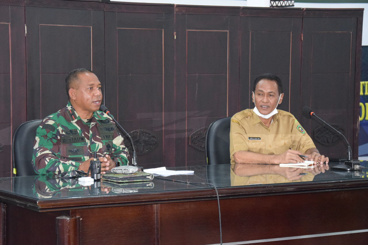 AMBON, MARINYO.COM- Komandan Korem (Danrem) 151/Binaiya Brigjen TNI Arnold A.P. Ritiauw Bersama Pemerintah Provinsi Maluku dan OPD terkait, mengadakan Rapat Koordinasi Tentang perintah pemerintah pusat terkait larangan mudik lebaran Hari Raya Idul Fitri 1442 H di masa Pandemi Covid-19 Tahun 2021 bertempat di Makorem 151/Binaiya Jl. Ahmad Yani No.1, Kel. Batu Gajah, Kecamatan. Sirimau, Kota Ambon, Senin (3/5/2021).