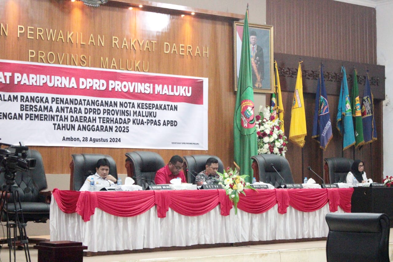 AMBON, MARINYO.COM- Dewan Perwakilan Rakyat Daerah Provinsi Maluku, Rabu (28/8/2024) menggelar Rapat Paripurna dalam rangka Penandatanganan Nota Kesepahaman bersama antara DPRD Provinsi Maluku dengan Pemerintah Daerah, terhadap Kebijakan Umum Anggaran (KUA) dan Prioritas Plafon Anggaran Sementara (PPAS) Anggaran Pendapatan dan Belanja Daerah (APBD) Tahun Anggaran 2025.