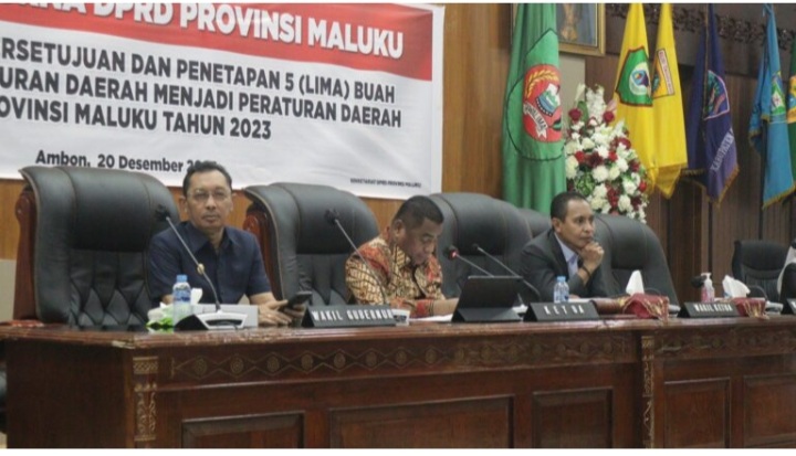 AMBON, MARINYO.COM- DPRD Provinsi Maluku, menetapkan enam Rancangan Peraturan Daerah (Ranperda) menjadi Perda Provinsi Maluku Tahun 2023. Penetapan Perda dihadiri Wakil Gubernur Maluku Drs. Barnabas Nathaniel Orno, Rabu (20/12/2023).