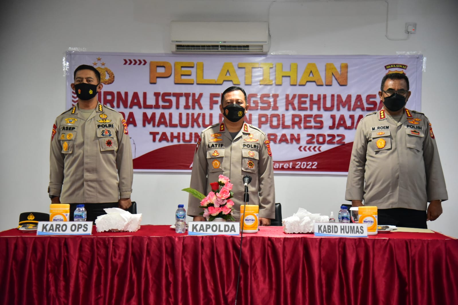 Pelatihan peningkatan kemampuan jurnalistik fungsi kehumasan bagi personil humas di Polda Maluku dan Polres jajaran ini berlangsung di aula lantai 2 Marina Hotel, Kota Ambon, Rabu (16/3/2022).