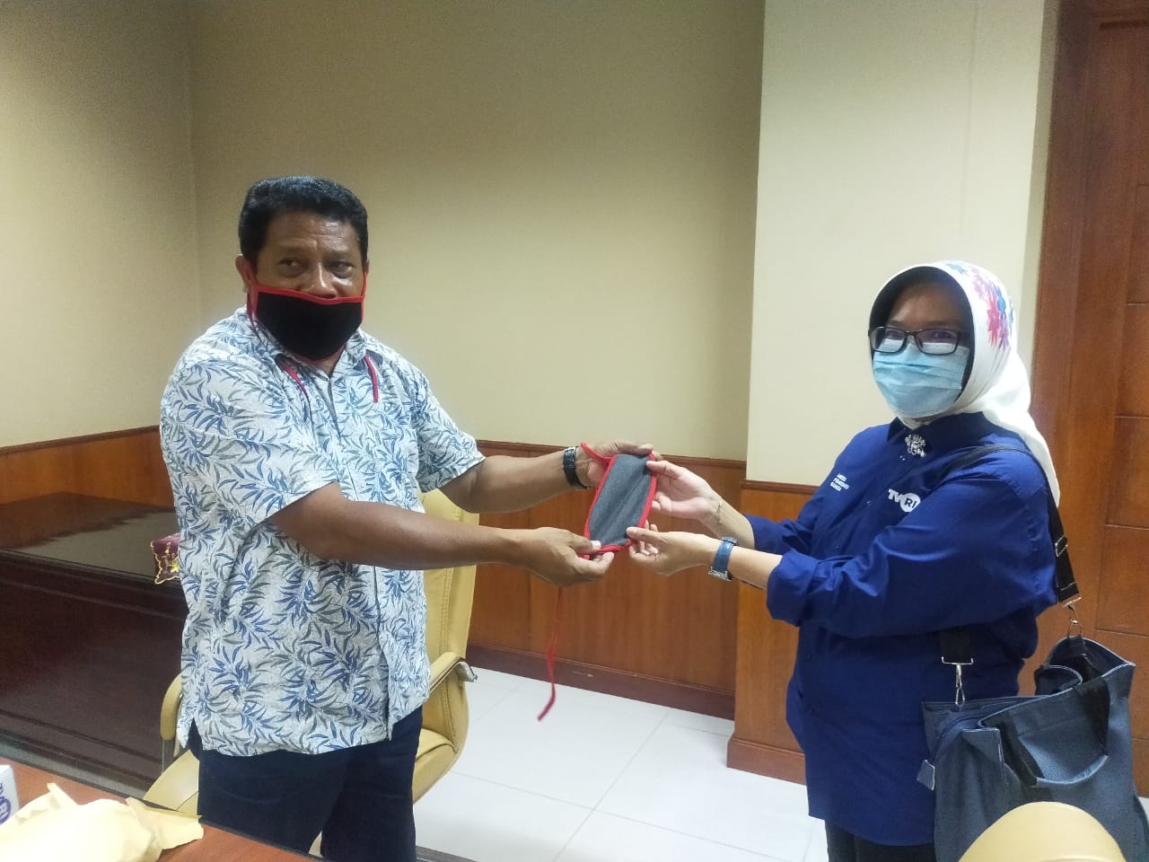 Pemberian bantuan berupa masker ini diterima secara simbolis oleh salah satu wartawan TVRI Ambon, Frida Raiman.