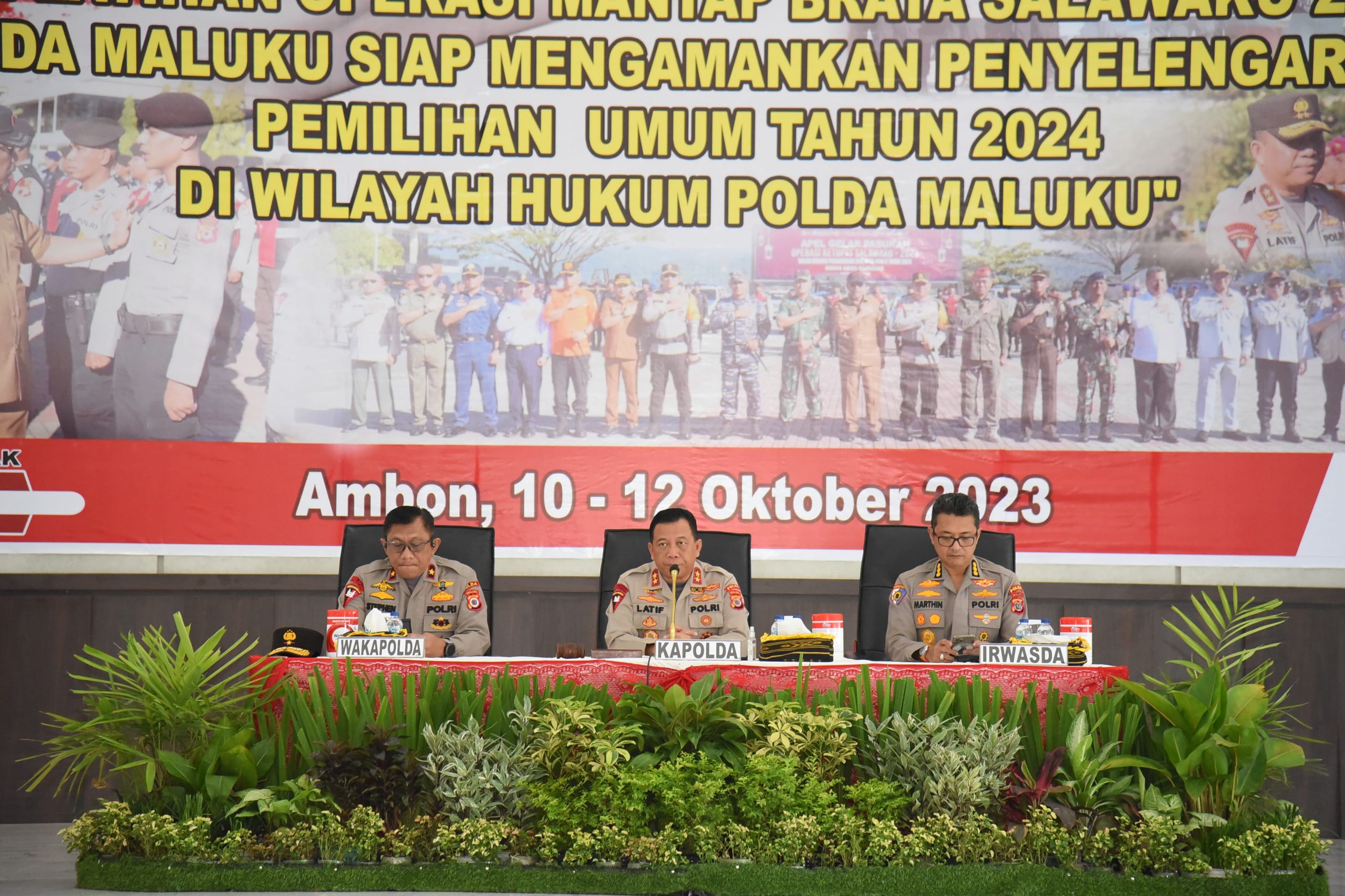 AMBON, MARINYO.COM- Kepala Kepolisian Daerah Maluku Irjen Pol Lotharia Latif, membuka kegiatan pelatihan pra operasi Mantap Brata Salawaku 2023 – 2024. Kegiatan itu dilaksanakan di Gedung Presisi Polda Maluku, Kota Ambon, Selasa (10/10/2023).