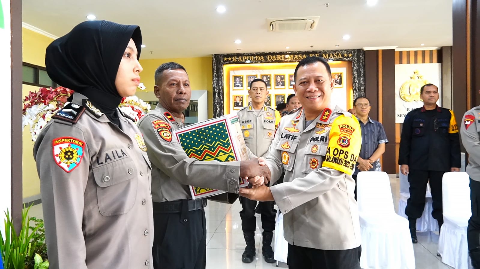 AMBON, MARINYO.COM- Kapolda Maluku Irjen Pol Drs. Lotharia Latif SH., M.Hum menyerahkan bingkisan parcel lebaran Idul Fitri 1445 Hijriah kepada perwakilan personel Polda Maluku yang beragama muslim.
