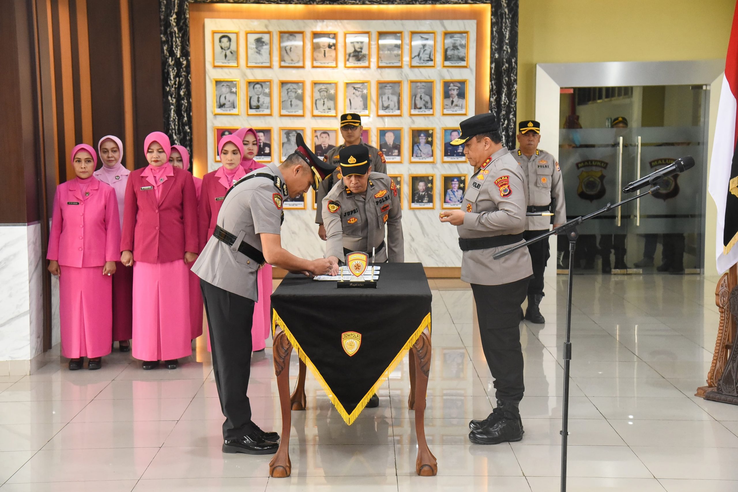 Upacara penyerahan jabatan Karo SDM dari Pejabat lama Kombes Pol Leo Surya Nugraha Simatupang S.Ik, kepada Pejabat yang baru Kombes Pol Agus Nugroho S.Ik., MH ini berlangsung di Lobby lantai 1 Mapolda Maluku, Tantui, Kota Ambon, Kamis (15/8/2024).