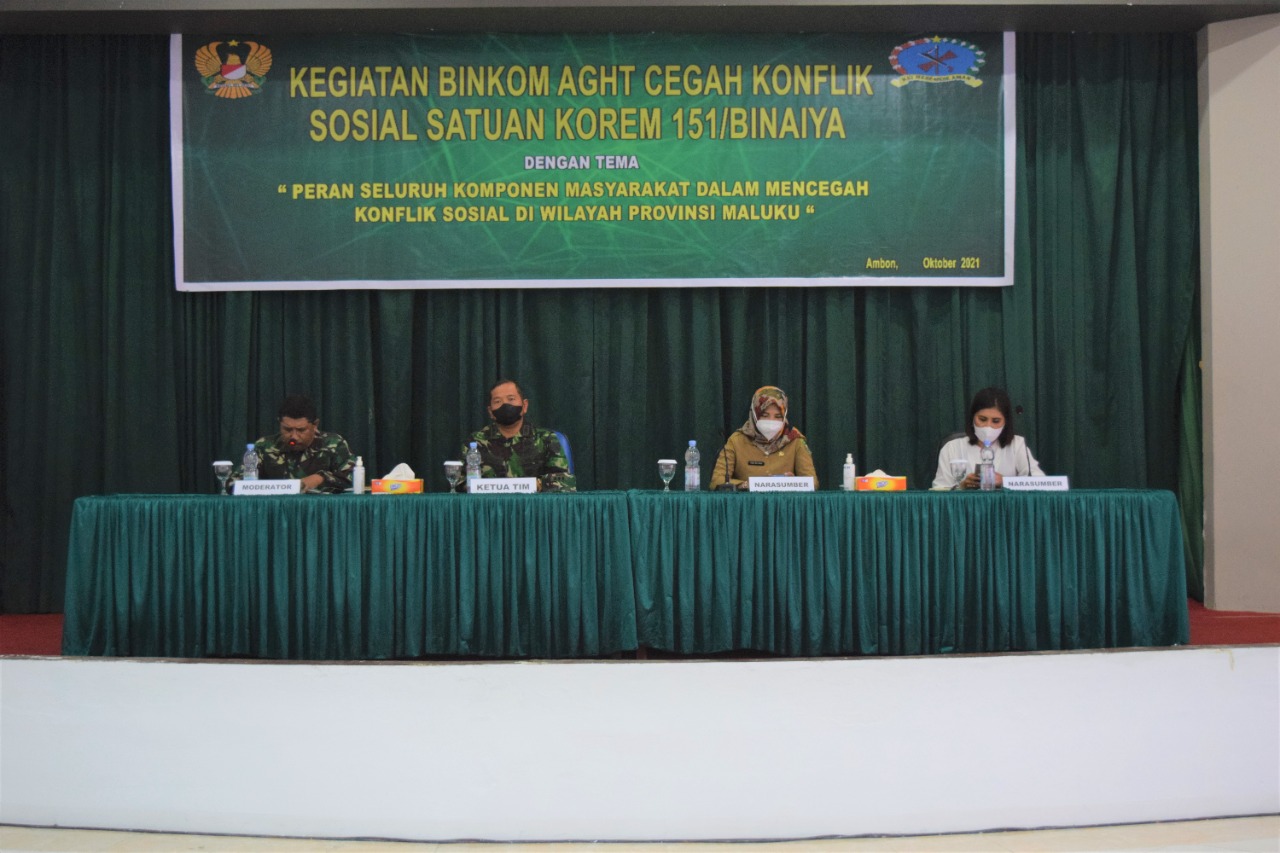 AMBON, MARINYO.COM- Korem 151/Binaiya menggelar sosialisasi Pembinaan Komunikasi (Binkom) ancaman, gangguan, hambatan dan tantangan (AGHT). Kegiatan cegah konflik sosial ini diikuti 150 orang peserta, bertempat di Aula Slamet Riyadi Makorem 151/Binaiya, Senin (18/10/2021).