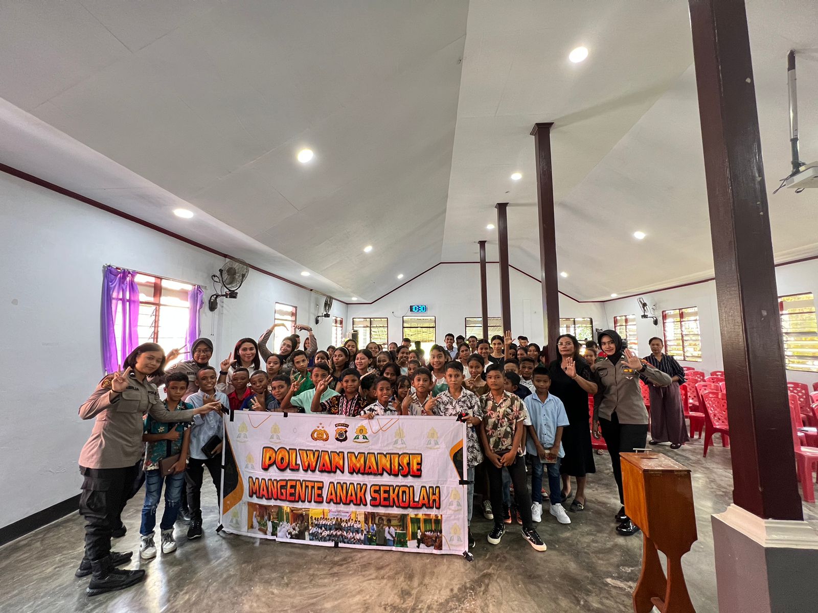 AMBON, MARINYO.COM- Kepolisan Wanita (Polwan) Polda Maluku mengunjungi anak-anak di Sekolah Minggu Tunas Pekabaran Injil (SMTPI) yang bertempat di gedung Gereja Sola Scriptura Suli Atas, Kecamatan Salahutu, Kabupaten Maluku Tengah, Minggu (16/7/2023).