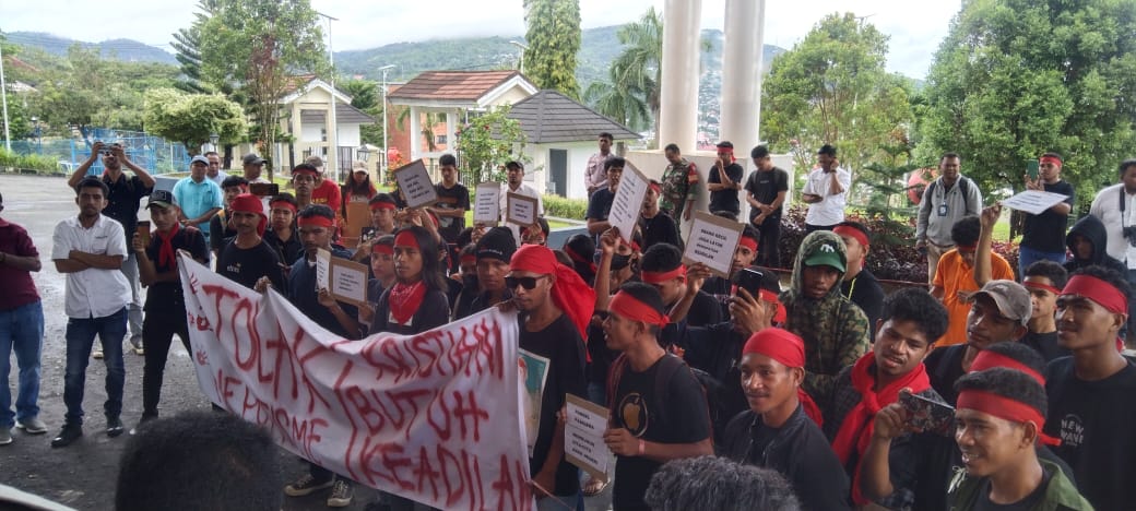 Aksi berlangsung di gedung DPRD, Rabu (12/6/2024), dipimpin Kalep Yamarua selaku koordinator aksi. Dengan menggenakan kain berang di Kepala, puluhan pemuda-pemudi Alifuru datang membawa kain bertuliskan “Tolak Nepotisme, Kristinie Butuh Keadilan”.