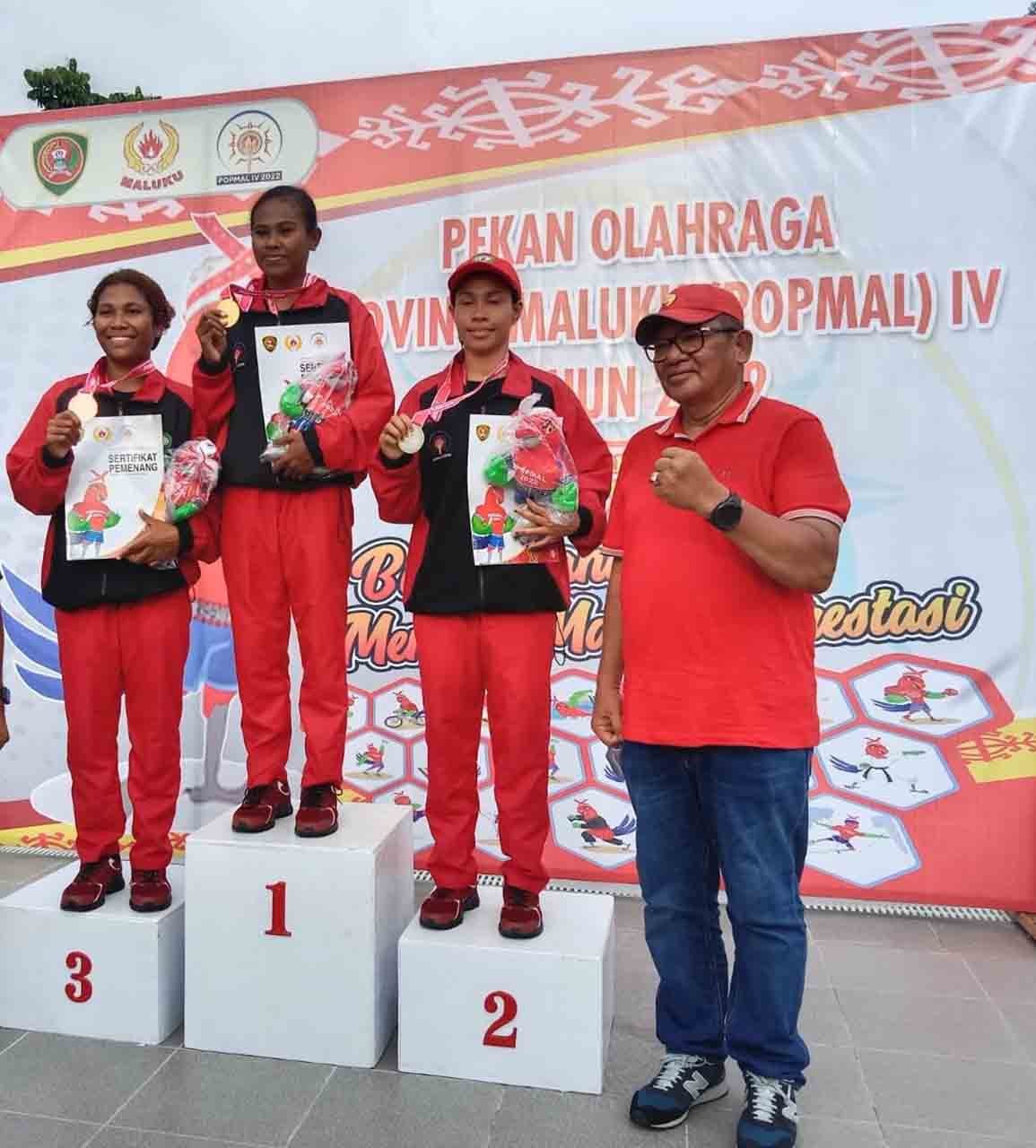 Medali untuk pemenang Nomor Kata Perorangan Putri diserahkam oleh Penjabat Bupati Kepulauan Tanimbar Daniel E Indey sementara Nomor Kata Perorangan Putra diserahkan oleh Ketua Umum KONI Kota Ambon Agus Ririmase. (***)