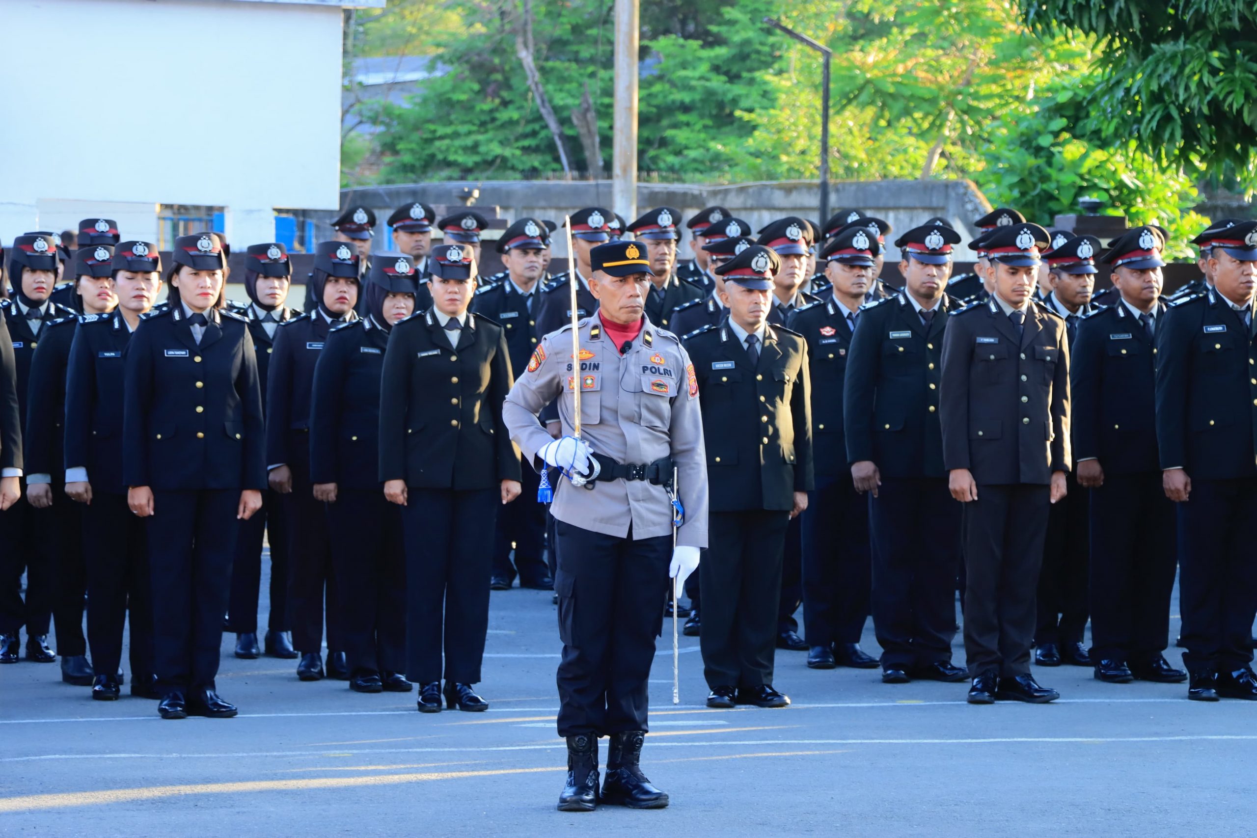 Upacara tersebut diikuti oleh enam pleton yang terdiri dari perwira pejabat utama (PJU), perwira pertama (Pama), pasukan bersenjata, staf gabungan, Satuan Lalu Lintas, serta pleton gabungan dari Satuan Intel, Reserse Kriminal (Sat Reskrim), Narkoba (Sat Narkoba), dan ASN Polri.