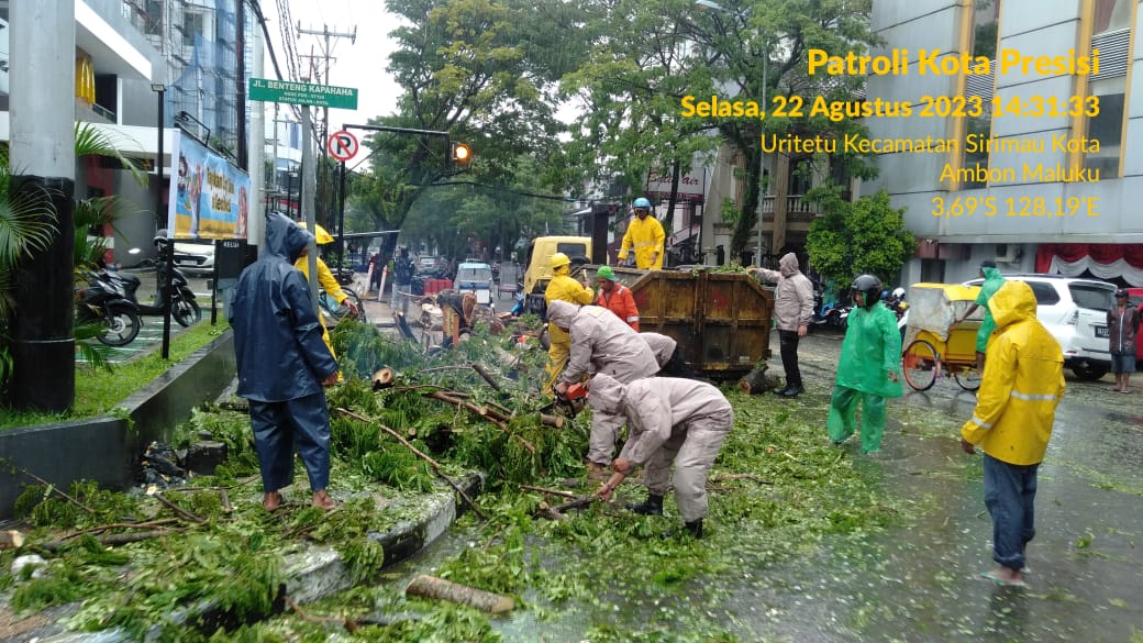 Beruntung, personil Samapta Polresta Pulau Ambon dan Pulau-Pulau Lease bergerak cepat bersama petugas Tata Kota Ambon dan warga sekitar melakukah pembersihan pohon tumbang dan membersihkan dahan pohon yang menghalangi jalan akibat curah hujan yang deras.