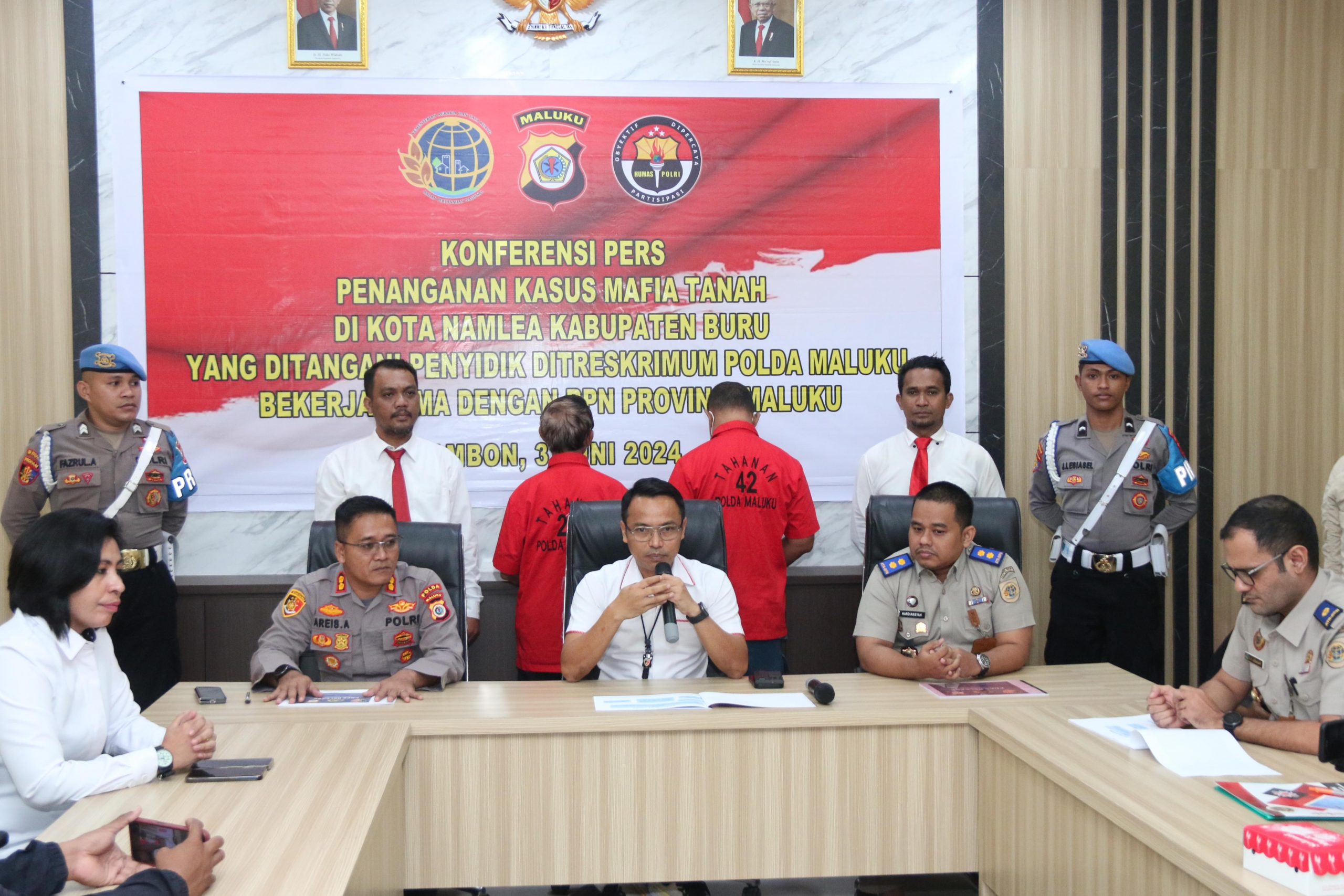 Pengungkapan kasus mafia tanah diungkapkan Polda Maluku melalui konferensi pers yang dipimpin Plt Kabid Humas Polda Maluku, AKBP. Aries Aminnullah. Turut hadir Direktur Reskrimum Polda Maluku Kombes Pol Andri Iskandar dan Kabid Pengendalian dan Penanganan Sengketa BPN Provinsi Maluku, Hardiansyah.