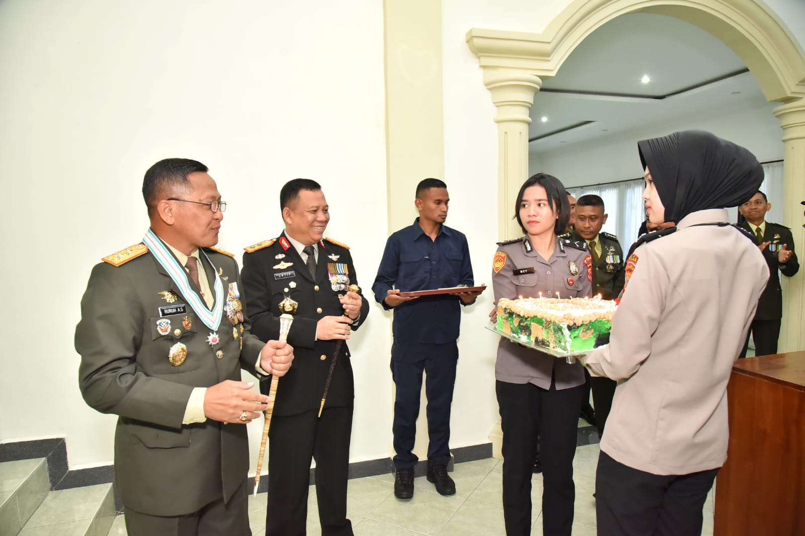 Kapolda Maluku memberikan surprise kue ulang tahun kepada Pangdam XVI/Pattimura, Mayjen TNI Ruruh A. Setyawibawa. Kapolda saat itu didampingi oleh Karo Ops, dan Dansat Brimob Polda Maluku.