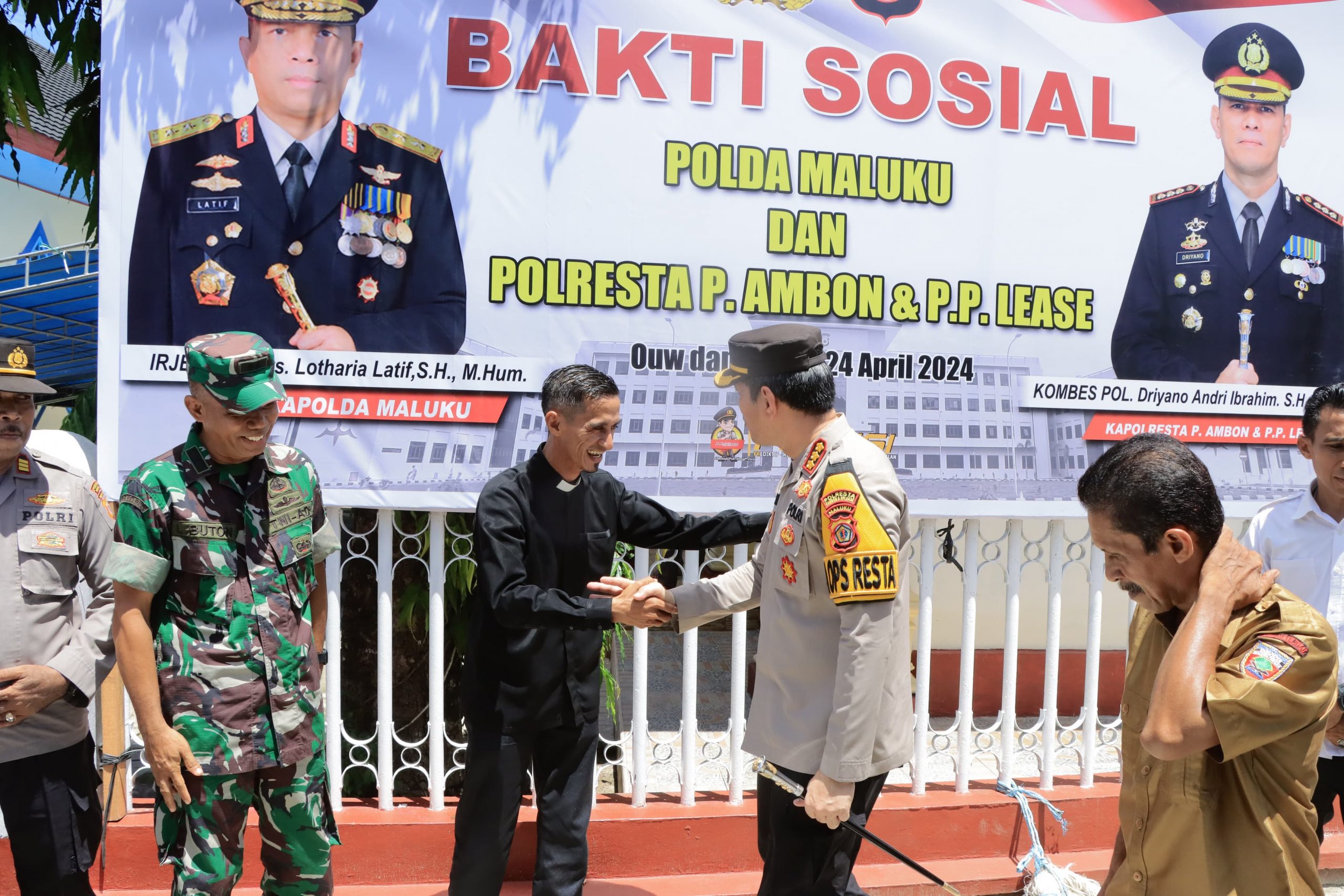 AMBON, MARINYO.COM- Kepolisian Daerah Maluku bersama Polresta Pulau Ambon dan Pulau-pulau Lease melaksanakan kegiatan bakti sosial (Baksos) yang bertempat di negeri Ulath dan Negeri Ouw, Kecamatan Saparua Timur, Kabupaten Maluku Tengah, Rabu (24/4/2024).