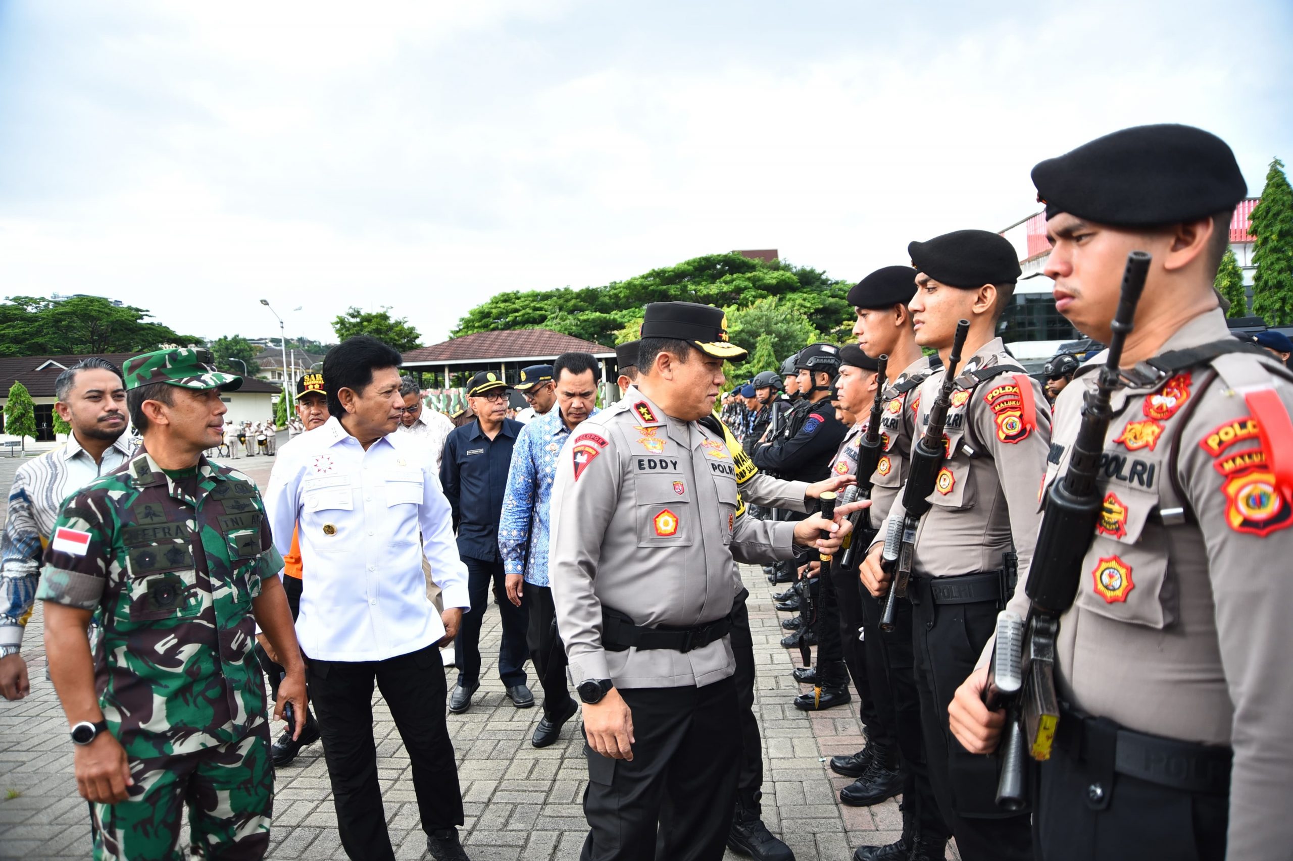 AMBON, MARINYO.COM- Kepala Kepolisian Daerah Maluku Irjen Pol. Drs. Eddy Sumitro Tambunan, M.Si, dan Pejabat Gubernur Maluku, Sadali Ie, memimpin apel gelar pasukan Operasi Lilin Salawaku Polda Maluku.