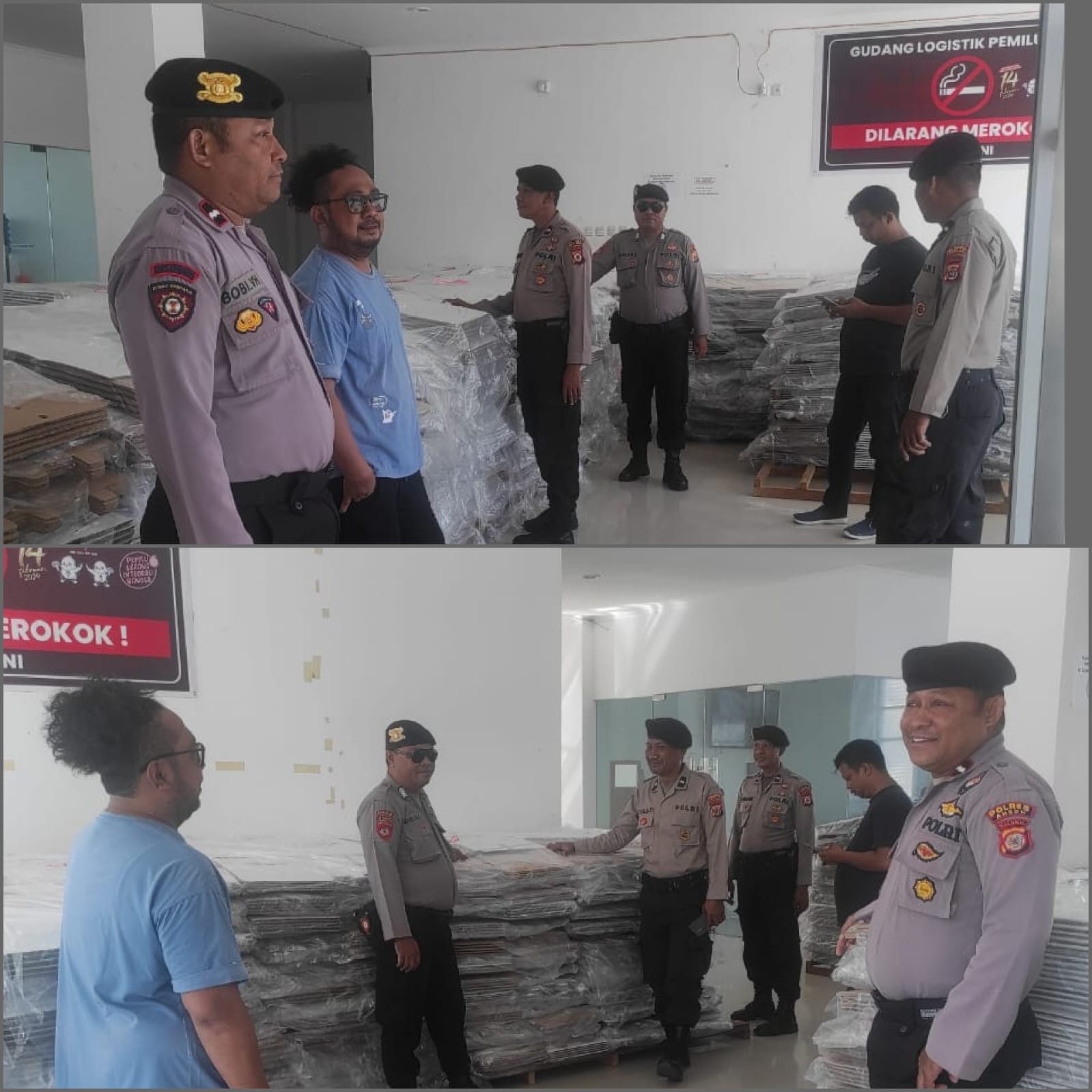 Ka Jaga Aipda J. Van Harling didampingi personil sebanyak lima orang masing-masing Aipda R. Barakati, Aipda M. Fokaaya, Bripka M. Hehanussa, Aipda B. Manakane (Intel), dan Bripka Benly Rolly Leasa (Reskrim) tergabung Satgas Preventif OMB Salawaku 2023-2024 melakukan penjagaan intensif terhadap gudang logistik Pemilu untuk mencegah potensi tindakan yang dapat mengganggu integritas dan ketersediaan materi pemilu.