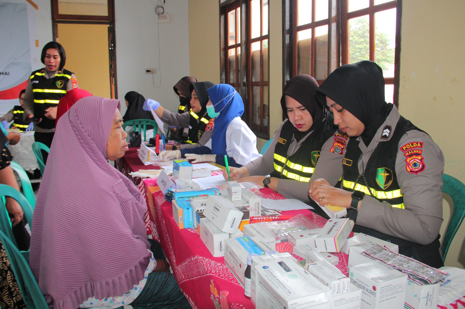 AMBON, MARINYO.COM- Kepolisian Wanita Polda Maluku menggelar bakti kesehatan kepada masyarakat di dusun Air Manis, negeri Laha, kecamatan Teluk Ambon, kota Ambon, Kamis (27/7/2023).