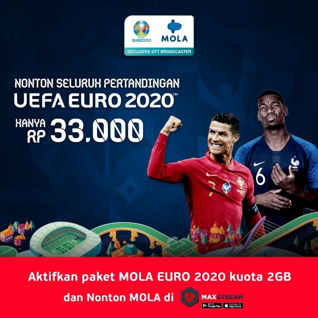 “Harga paket ini dikenai biaya Rp 33.000,- dan akan mendapatkan Kuota MAXstream sebesar 2GB dengan masa aktif 30 hari. Pelanggan juga akan mendapatkan akses untuk menyaksikan semua pertandingan EURO 2020 melalui MAXstream dan MOLA TV,” jelas dia.