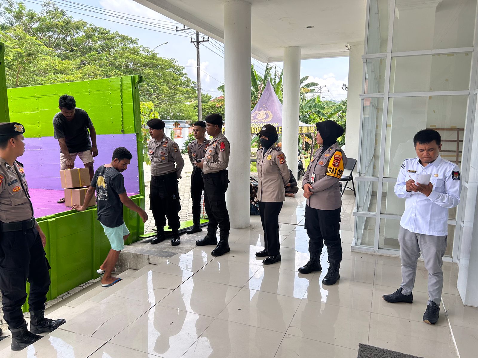 AMBON, MARINYO.COM- Personel Satgas Operasi Mantap Brata (OMB) Salawaku Polda Maluku mengamankan proses pemindahan surat suara dari gudang penyimpanan logistik milik KPU Kota Ambon yang berada di Poka, Kecamatan Teluk Ambon, ke Karang Panjang, Kecamatan Sirimau, Kota Ambon, Kamis (4/1/2024).