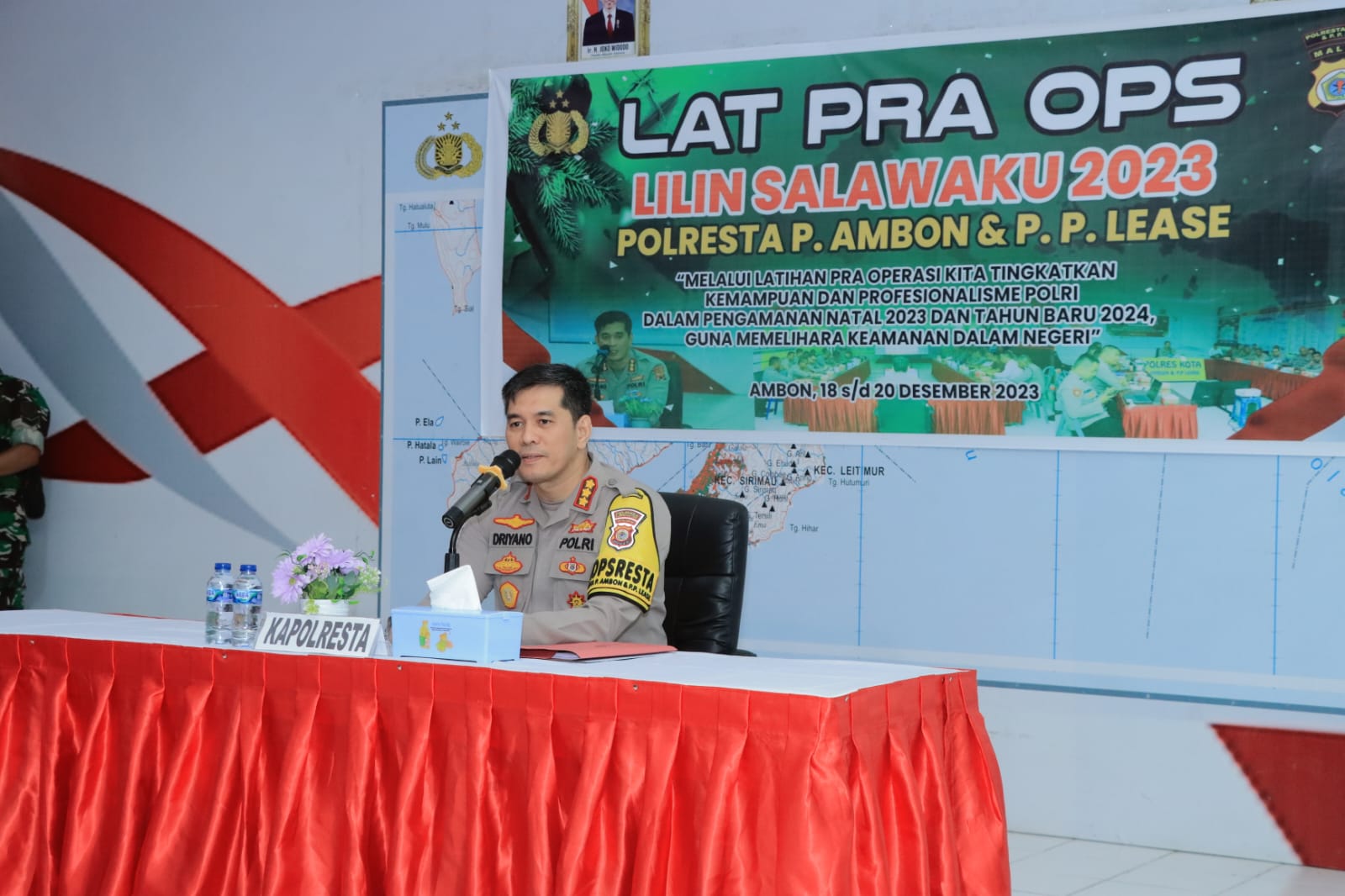 AMBON, MARINYO.COM- Menjelang pelaksanaan Operasi Lilin Salawaku 2023, Polresta Ambon menggelar latihan Pra Operasi (Lat Pra Ops) dipimpin Kapolresta Ambon Kombes Pol Driyano Andri Ibrahim S.H., S.I.K. Lat pra ops berlangsung di Aula Prima Polresta Ambon, Rabu (20/12/2023).