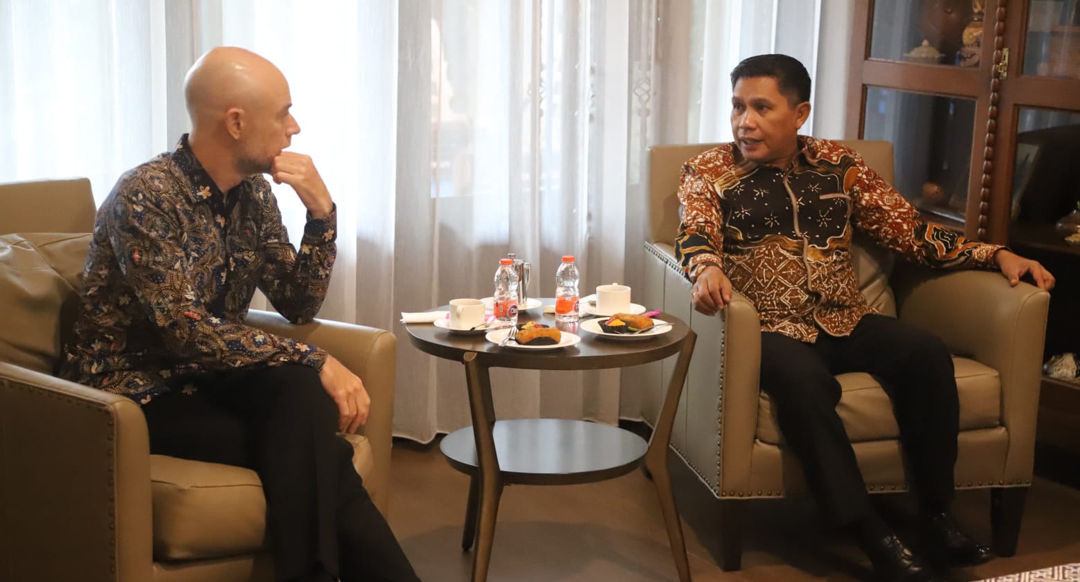 SURABAYA,MARINYO.COM – Ditengah kesibukkan dalam mengikuti kegiatan Musyawarah Nasional (Munas) VII, Asosiasi Pemerintah Kota se-Indonesia (APEKSI), di Kota Surabaya, Walikota Ambon, Bodewin Wattimena menyempatkan waktu untuk menemui, Konsulat Jenderal (Konjen) Amerika Serikat, Christoper Green, di kawasan jalan Taman golf Kota Surabaya, Rabu, (7/5/2025).