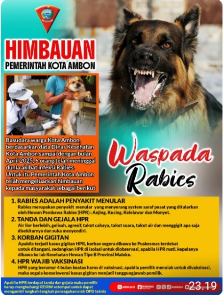 “Pemerintah Kota Ambon merasa perlu untuk menyampaikan himbauan terbuka ini kepada masyarakat setelah menerima laporan resmi dari Dinas Kesehatan terkait meningkatnya kasus gigitan Hewan Pembawa Rabies (HPR). sampai April tahun ini, enam warga telah meninggal dunia akibat rabies, dan ini tidak bisa dianggap enteng,” ujar Lekransy.